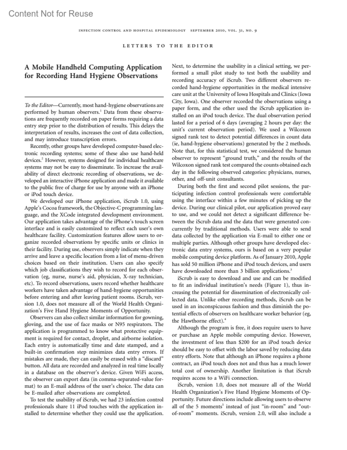 Infection Control and Hospital Epidemiology 31(9):p 979-980, September 2010.