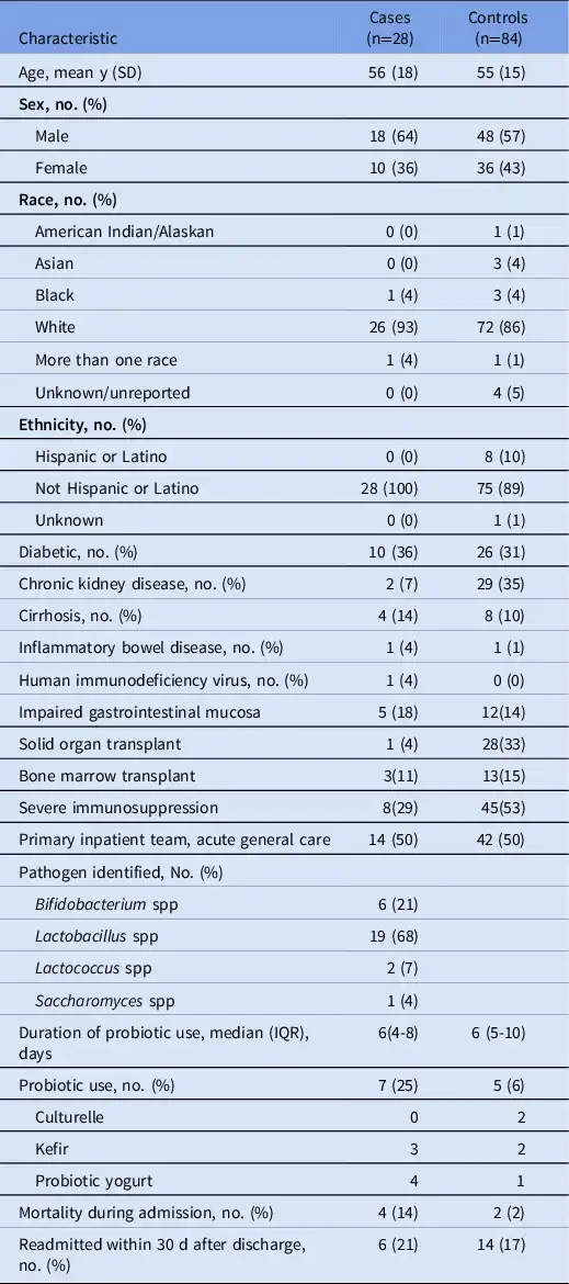 Our study identified a significant association between probiotic use and invasive infection with common probiotic organisms, with notable differences between cases and controls. Cases were significantly more likely to have had abdominal surgery and to die in the hospital. The association with abdominal surgery may be attributed to impaired gastrointestinal integrity or the use of postoperative probiotics. Important differences in the control group were significantly higher rates of organ transplantation and severe immunosuppression.