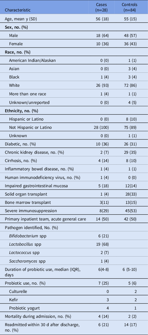 Of the 31 patients who met the case criteria for our study, we identified matched controls for all but 3 (excluded because adequate controls could not be identified), for a total of 112 study participants (28 cases and 84 controls). The study population primarily consisted of white males with an overall average age of 56 years (Table 1). Moreover, 12 patients (11%) were prescribed probiotics with a median duration of 6.5 days (range, 5–9.5). The most common organism was Lactobacillus (68%) and the least common was Saccharomyces (4%). All 7 cases receiving Lactobacillus containing kefir or probiotic yogurt grew Lactobacillus. Using the Pearson’s χ2 test, we observed that cases were more likely to have had abdominal surgery within the past month or year (P = .008 and P = .013, respectively). In addition, the cases had significantly higher in-hospital mortality (P = .015) (Table 2). Controls were more likely to have chronic kidney disease (P = .005), to have undergone solid-organ transplantation (P = .010), and to be severely immunosuppressed (P = .022). Of 28 matched groups (consisting of 1 case and 3 controls), 21 groups were all unexposed to probiotics, 1 group included cases and controls all exposed to probiotics, and 6 groups had a combination of exposed and unexposed. Based upon the regression analysis, we estimated that the odds of probiotic use among those with invasive infections were 127 times greater than the odds of probiotic use among patients without invasive infections (95% CI, 6.21–2,600).