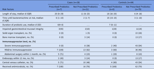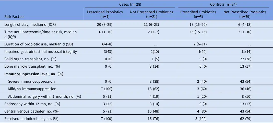The primary exposure of interest was use of probiotics. Probiotic use was defined as administration of Lactobacillus capsules, probiotic yogurt, or probiotic kefir documented in the EHR. Data were also collected for patient demographics and suspected confounding variables. Immunosuppression was defined as severe (bone-marrow or solid-organ transplant patients or patients with liquid or solid tumors) or mild to none (all other patients). Gastrointestinal (GI) integrity was determined using International Classification of Disease, Tenth Revision (ICD-10) codes for the following conditions: GI artificial opening, perforation, fistula, ulcer, mucositis, complication of GI device, diagnosis of Crohn’s disease, ulcerative colitis, or other noninfective colitis. Probiotic use, abdominal surgery, endoscopy, central venous catheter use, and antimicrobial use were only evaluated within the patient’s time at risk. A descriptive statistical analysis was performed to characterize the study population. We used a mixed effects logistic regression model to measure the odds ratios (ORs) and 95% confidence intervals (CIs) for the association between probiotic use and subsequent infection. This analytic approach allowed for appropriate handling of the matched study design and the sparse distribution of exposure across strata. Statistical analysis was performed using STATA version 15 software (StataCorp, College Station, TX).