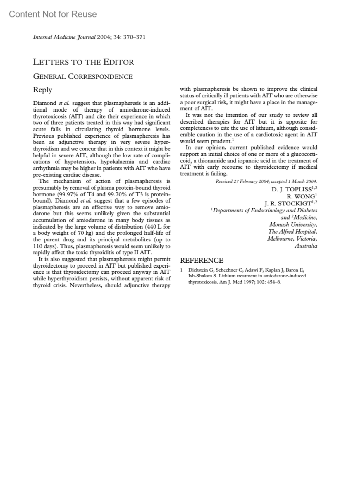 Plasmapheresis as a potential treatment option for amiodarone-induced thyrotoxicosisTOPLISS, D. J.WONG, R.STOCKIGT, J. R.Author information1Departments of Endocrinology and Diabetes, Monash University, The Alfred Hospital, Melbourne, Victoria, Australia2Departments of Medicine, Monash University, The Alfred Hospital, Melbourne, Victoria, AustraliaReceived 27 February 2004; accepted 1 March 2004.Internal Medicine Journal 34(6):p 370, June 2004.Copyright © 2004 Blackwell Publishing Ltd.