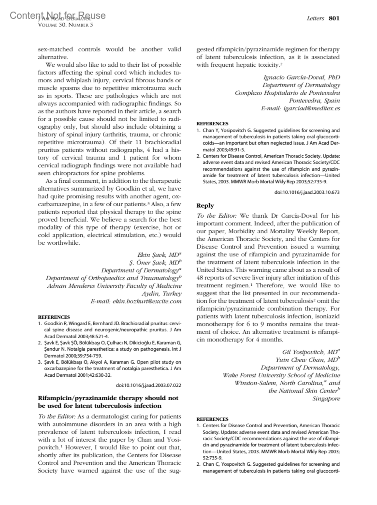 Rifampicin/pyrazinamide therapy should not be used for latent tuberculosis infectionYosipovitch, Gil MDChan, Yuin Chew MDAuthor informationaDepartment of Dermatology, Wake Forest University School of Medicine, Winston-Salem, North Carolina, USAbNational Skin Center, SingaporeJournal of the American Academy of Dermatology 50(5):p 801-802, May 2004.Copyright © 2004 by Mosby, Inc.