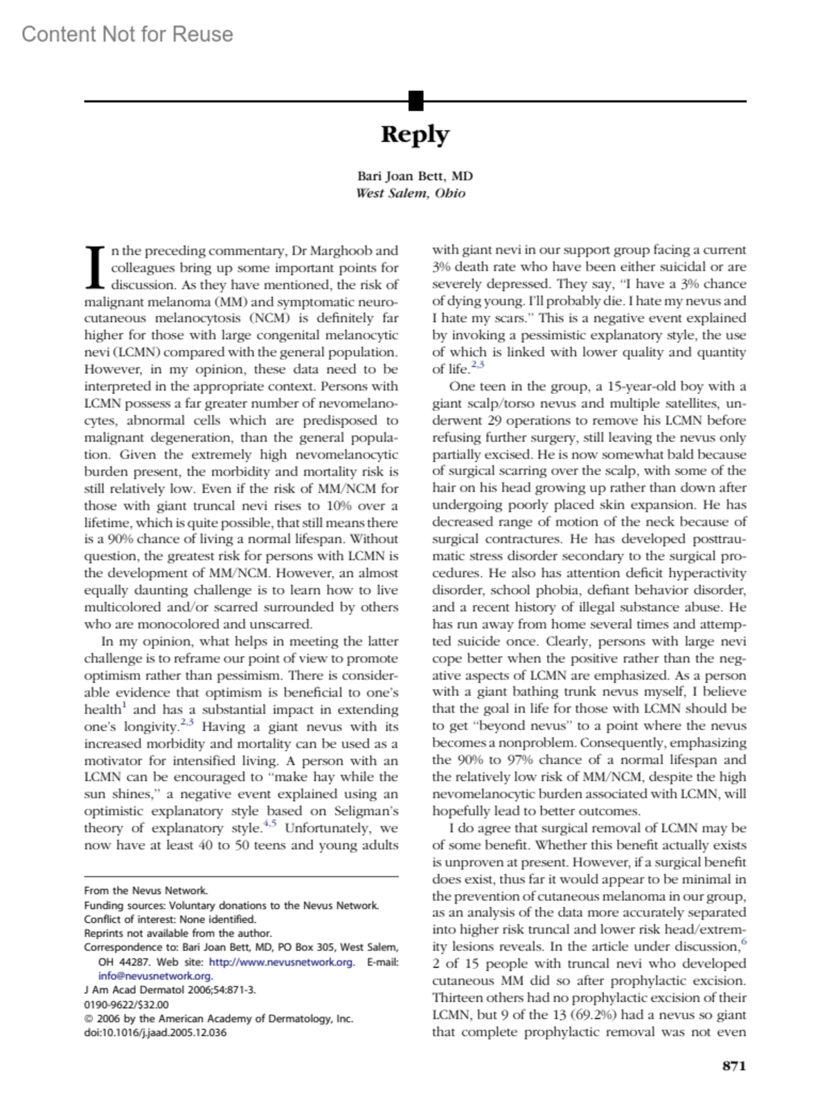 Large congenital melanocytic nevi, risk of cutaneous melanoma, and prophylactic surgeryBett, Bari Joan MDAuthor informationNevus Network, West Salem, OhioCorrespondence to: Bari Joan Bett, MD, PO Box 305, West Salem, OH 44287. Web site: http://www.nevusnetwork.org. E-mail: [email protected].Funding sources: Voluntary donations to the Nevus Network.Conflict of interest: None identified.Reprints not available from the author.Journal of the American Academy of Dermatology 54(5):p 871-873, May 2006.Copyright © 2006 by Mosby, Inc.