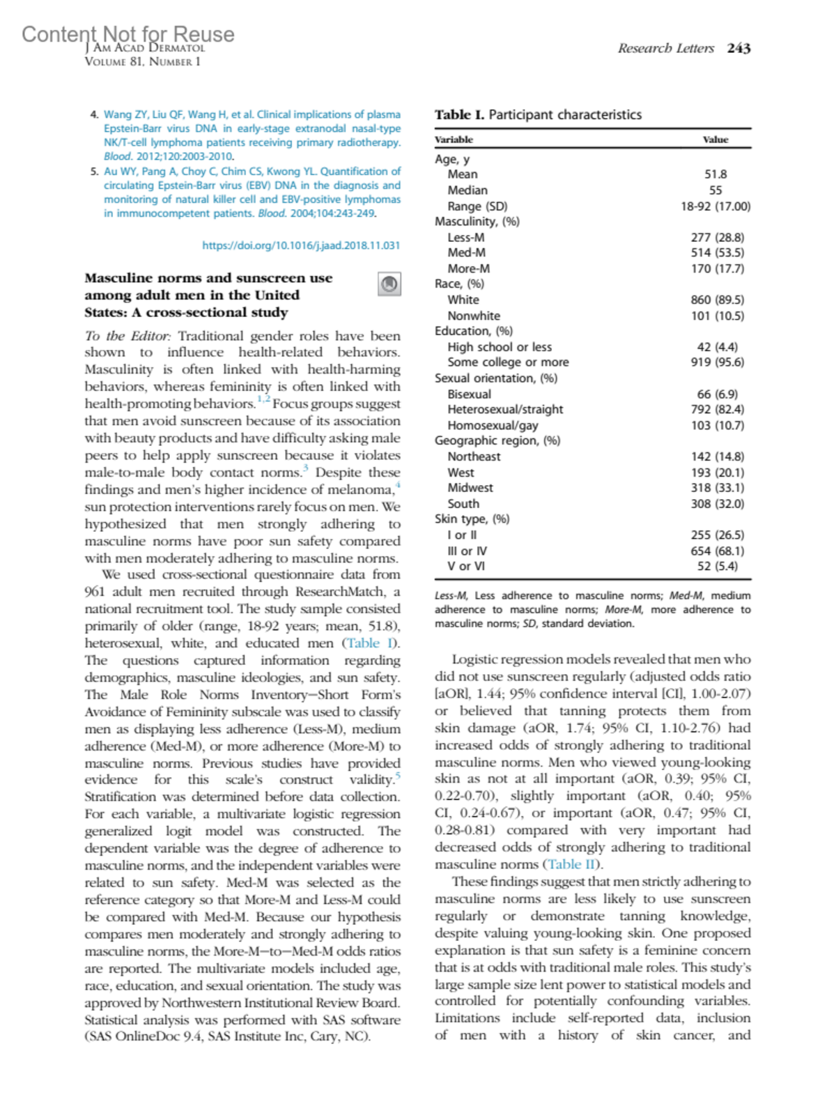 Masculine norms and sunscreen use among adult men in the United States: A cross-sectional study