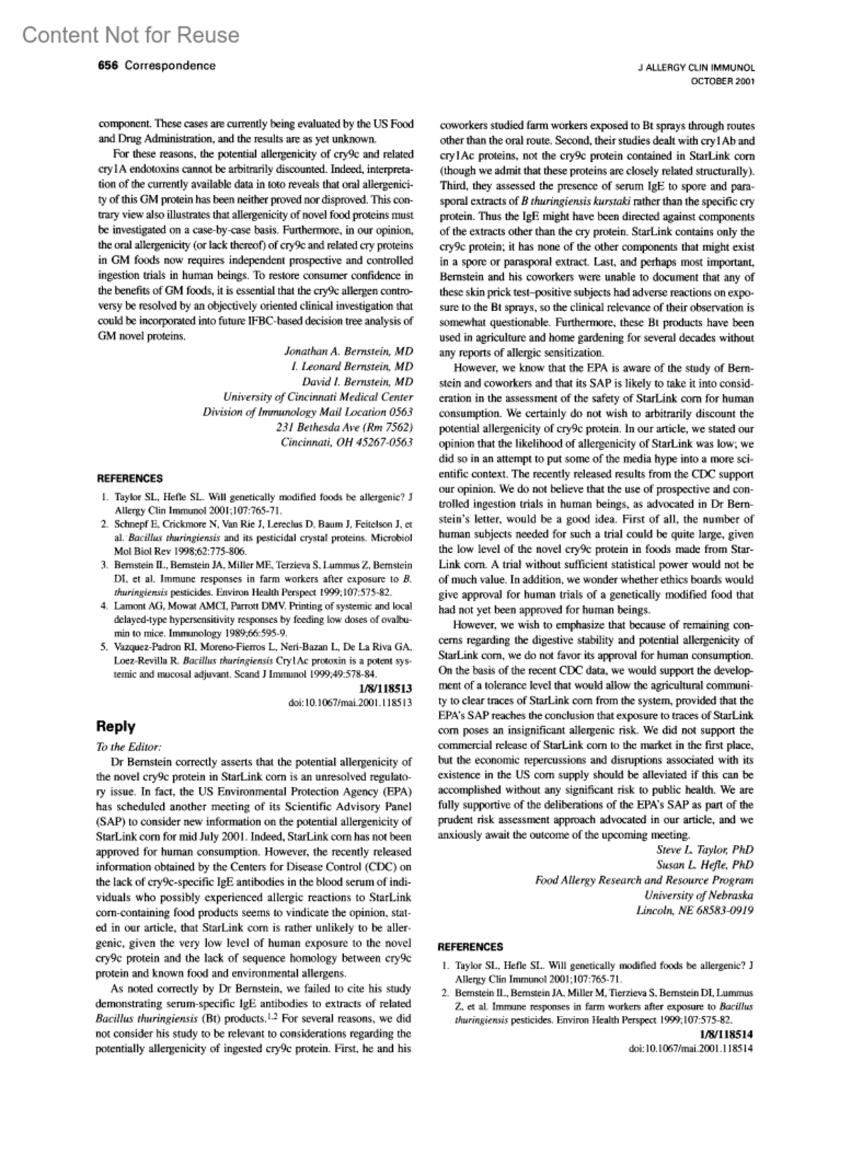 Allergenicity of cry9cAn unresolved issueTaylor, Steve L. PhDHefle, Susan L. PhDAuthor informationFood Allergy Research and Resource Program University of Nebraska Lincoln, NE 68583–0919Journal of Allergy & Clinical Immunology 108(4):p 656, October 2001.Copyright © Mosby-Year Book Inc. 2001. All Rights Reserved.