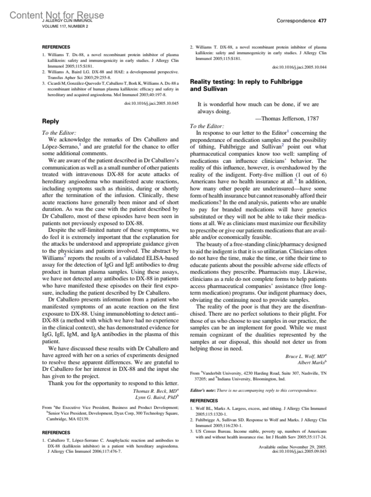 Journal of Allergy & Clinical Immunology 117(2):p 477, February 2006.