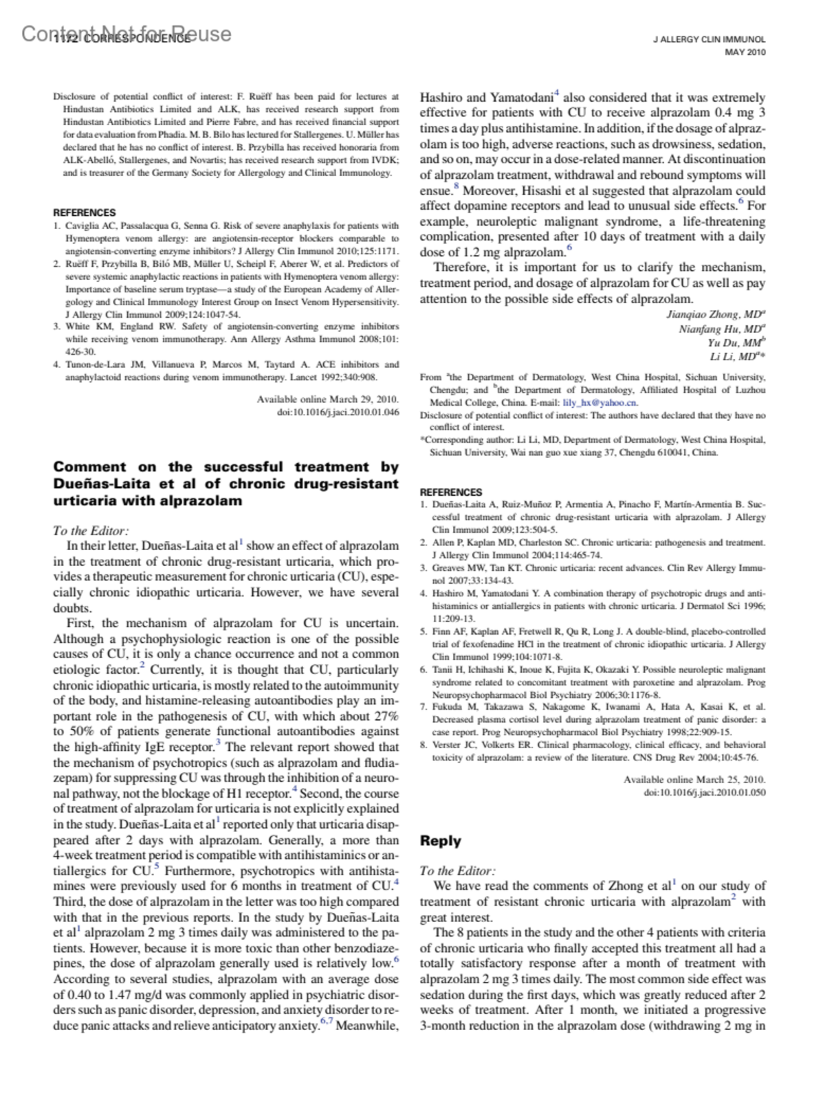 Journal of Allergy & Clinical Immunology 125(5):p 1172, May 2010.