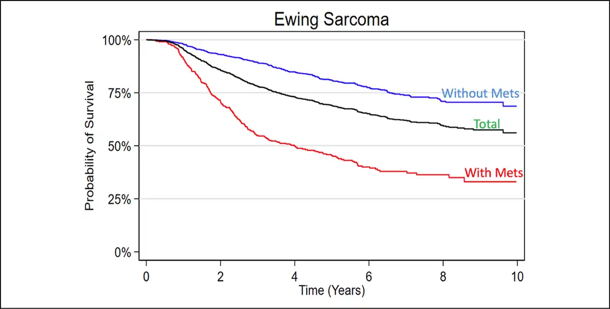 ES remains the second most common primary bone tumor in pediatric and adolescent patients in the United States with reportedly stagnant survival rates across the past few decades. Overall, this study's ES cohort exhibited an 84.7% 5-year survival rate in patients with localized disease compared with 50.4% for patients presenting with metastatic disease (73.9% overall). The improved survival for metastatic patients compared with prior studies is likely a reflection of improvements in adjuvant treatments and the establishment of multidisciplinary care teams. Multivariable regression showed that older age, larger tumor size, macrometastases, and positive margins all result in worse 5-year survival rates. This analysis serves to establish updated survival rates of pediatric ES treated within the United States to set standards for comparison among future studies. Continued multi-institutional and international collaboration is needed to optimize current treatment results and develop novel targeted therapies.