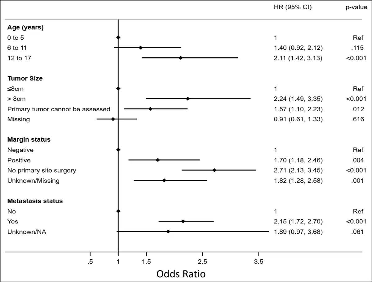Most patients were of adolescent age (57.6%) with the majority being non-Hispanic, White males (Table 1). Most patients had private insurance or other form of managed care (69.23%) followed by government-based insurance (28.19%; Table 1). When separated into alive vs deceased groups, adolescent age at diagnosis was proportionally more common in the deceased group (67.95% vs. 53.86), whereas no notable differences were observed between sex, race, Hispanic status, or insurance type observed (Table 2). Unadjusted patient demographic-specific variables associated with worse survival rates included increasing age (12 to 17 years, HR [95% CI] = 2.27 [1.54 to 3.37]) and Hispanic ethnicity (HR [95% CI] = 1.33 [1.05 to 1.68]), whereas sex, overall race, and insurance status had no notable effect (Table 3). After multivariable analysis, only adolescent age (12 to 17, HR [95% CI] = 2.11 [1.42 to 3.13]) was considered a notable predictor of worse 5-year survival (Figure 2).