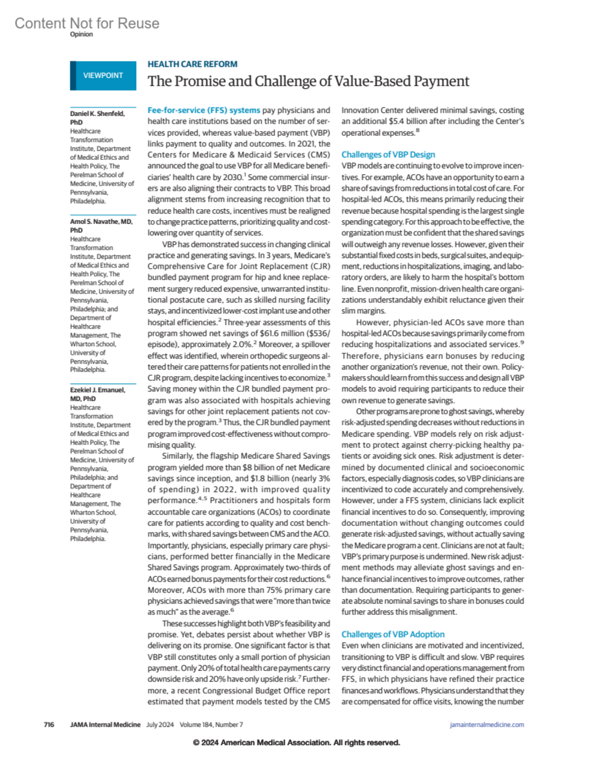Conflict of Interest Disclosures: Dr Shenfeld reported personal fees from Village MD outside the submitted work. Dr Navathe reported grants from the Hawaii Medical Service Association, Commonwealth Fund, Veterans Affairs Administration, Humana, Arnold Ventures, Robert Wood Foundation, United Healthcare, and Donaghue Foundation; personal fees from Naviss Healthcare, Medicare Payment Advisory Commission, Elsevier Press, Analysis Group, Advocate Physician Partners, Catholic Health Service Long Island, Federal Trade Commission, Hawaii Medical Service Association, and The SCAN Group; equity from Clarify Health; and noncompensated board membership for Integrated Services Inc outside the submitted work. Dr Emanuel reported personal fees from Rise Health, The Galien Foundation, Well Sky, Rightway Healthcare, Signature Healthcare Foundation, Healthcare Leaders of New York, MedImpact, Massachusetts Association of Health Plans, Princeton University, Philadelphia Committee on Foreign Relations, Yale University, Hartford Medical Society, Association of Academic Health Centers, Global Innovation Forum, Hawaii Medical Services Association, Queens Health System, Advocate Aurora Health Summit, University of Pittsburgh Medical Center, University of California San Francisco, Advocate Aurora Health, Cain Brothers Conference, Bowdoin College, Ontario Hospital Association, University of Oklahoma, The Quadrangle, Sanford Health, Health Plan Alliance, and Emory Health Care Leaders Retreat outside the submitted work; as well as membership with Notable, Village MD, Colton Center for Autoimmunity at Penn, JSL Health Fund, Peterson Center on Health Care, Clarify Health, Korri AI, Aberdeen Inc, Alto, Link Health Technologies, FeelBetter, Oncology Analytics (until 2022, now OncoHealth), Healthcare Foundry, Biden's Transition COVID-19 Committee, special advisory to the Director General of the World Health Organization (WHO), founding partner of COVID-19 Recovery LLC (until 2021), WHO COVID-19 Ethics & Governance Working Group, founding partner of Embedded LLC (until 2022), venture partner at Oak HC/FT (until 2021), Cellares, and the Health Innovation Exchange sponsored by United Nations Geneva.
