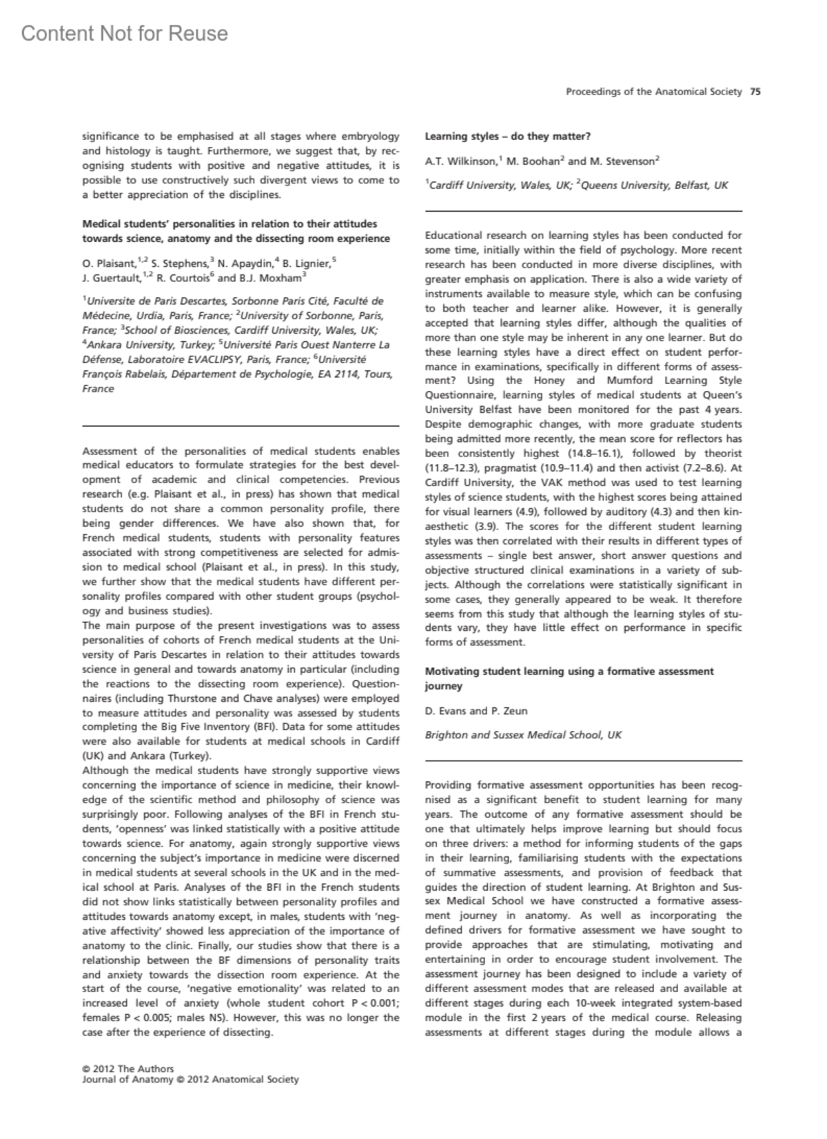 Motivating student learning using a formative assessment journeyEvans, D.Zeun, P.Author informationBrighton and Sussex Medical School, UKJournal of Anatomy 221(1):p 75-76, July 2012.Copyright © 2012 John Wiley & Sons, Ltd