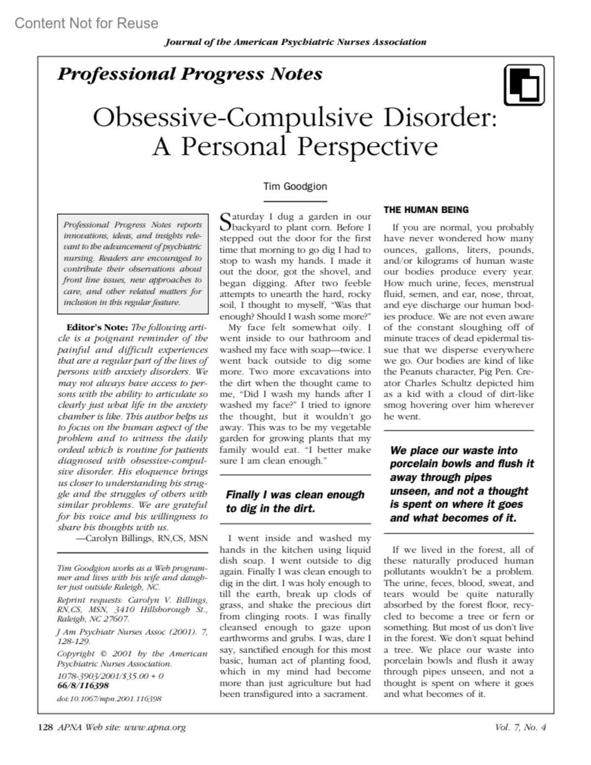 Editor's Note: The following article is a poignant reminder of the painful and difficult experiences that are a regular part of the lives of persons with anxiety disorders. We may not always have access to persons with the ability to articulate so clearly just what life in the anxiety chamber is like. This author helps us to focus on the human aspect of the problem and to witness the daily ordeal which is routine for patients diagnosed with obsessive-compulsive disorder. His eloquence brings us closer to understanding his struggle and the struggles of others with similar problems. We are grateful for his voice and his willingness to share his thoughts with us.