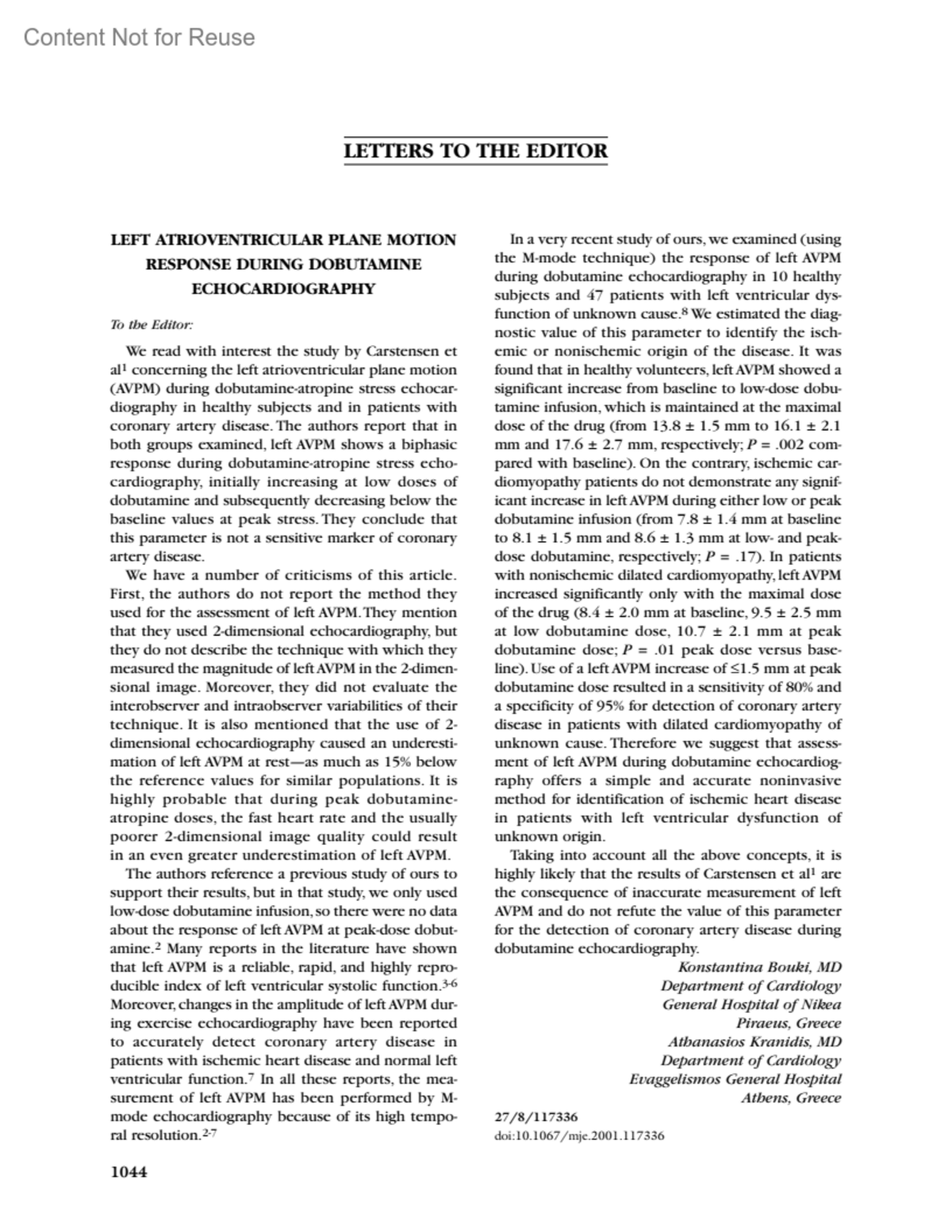 LEFT ATRIOVENTRICULAR PLANE MOTION RESPONSE DURING DOBUTAMINE ECHOCARDIOGRAPHYCarstensen, Steen MDAuthor informationDepartment of Medicine, B 2013, The Heart Center, Rigshospitalet, University of Copenhagen, Blegdamsvej 9, DK-2100 Copenhagen, Denmark27/8/117337doi:10.1067/mje.2001.117337Journal of the American Society of Echocardiography 14(10):p 1045-1046, October 2001.Copyright © 2001 by Mosby, Inc