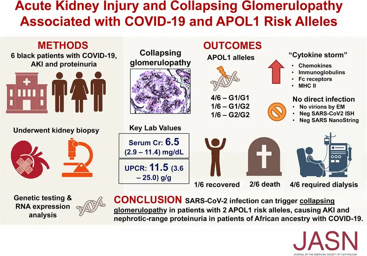 In summary, we present six Black patients with COVID-19 and two APOL1 risk alleles who presented with rapid worsening in renal function and proteinuria, with renal biopsies showing collapsing glomerulopathy without evidence of kidney parenchymal viral infection. Because collapsing glomerulopathy can often result in irreversible kidney damage and ESKD, this observation may have important public health implications for individuals with genetic risk factors. Further study is needed both from biopsy and autopsy to fully investigate the renal morphologic changes in patients with COVID-19 worldwide and uncover potential mechanisms with implications for treatment.