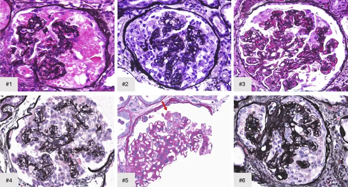 Collapsing glomerulopathy, showing collapse of glomerular tuft with overlying hypertrophy and hyperplasia of visceral epithelial cells and marked protein droplets in cases 1–6. Arrow, early segmental collapsing lesion. #1–#4 and #6, Jones methenamine silver; #5, Periodic acid–Schiff; original magnification, ×500 in #1 and ×400 in #2–#6.