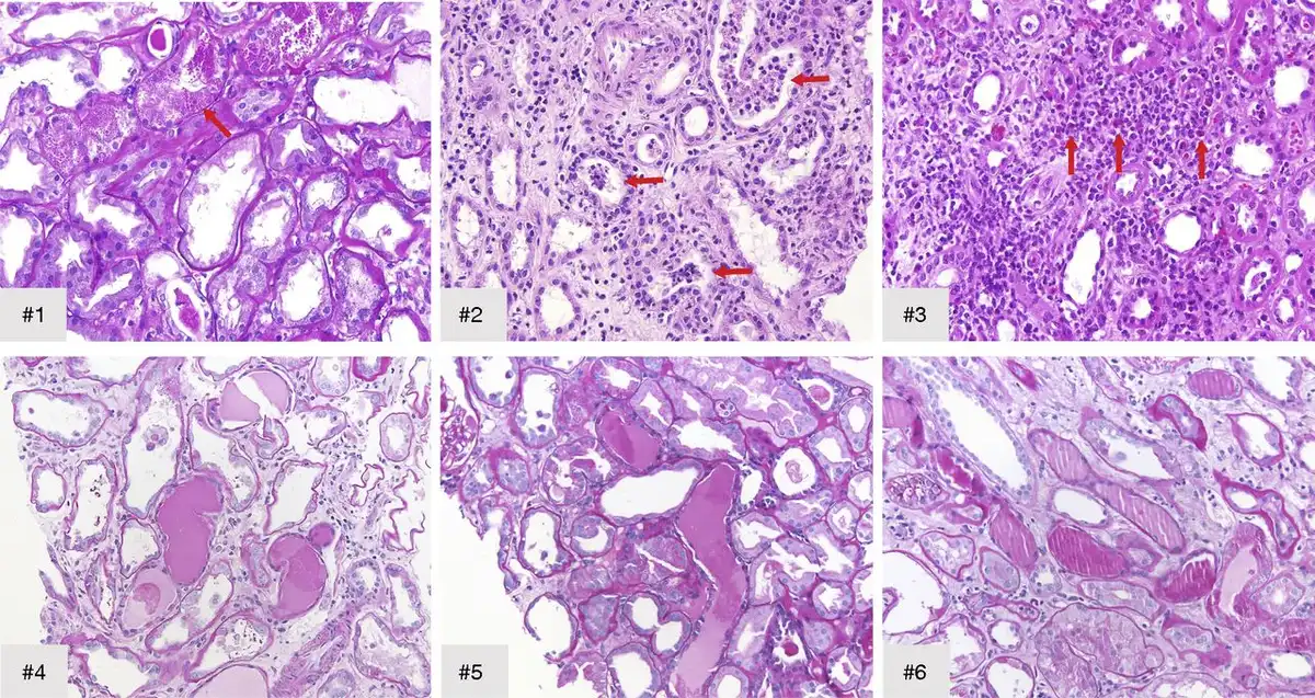 All biopsies show acute tubular injury with frequent tubular protein droplets. Arrow in #1, tubular protein droplets. In addition, case 2 (#2) showed diffuse patchy pleomorphic interstitial infiltrate with neutrophils and tubulitis, and rare tubules with intratubular neutrophils (arrows); case 3 (#3) showed focal acute interstitial nephritis with occasional foci of eosinophils (arrows), and microcystic tubules were present in all cases except #3. #1, #4–#6, Periodic acid–Schiff; #2 and #3, hematoxylin and eosin; original magnification, ×400 in #1–#3 and ×200 in #4–#6.