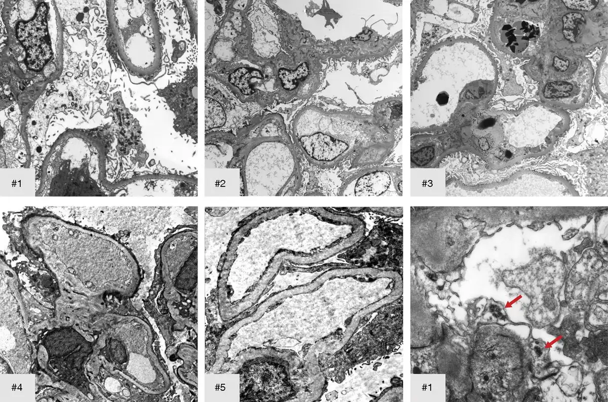 Transmission EM shows extensive foot process effacement and moderate microvillous transformation of podocytes in all cases. EM shows occasional reticular aggregates (arrow) in cytoplasm of endothelial cells (representative picture from #1). Original magnification, ×4400 in #1, top left; ×2200 in #2–#3; ×6000 in #4; ×8000 in #5; ×14,000 in #1, bottom right.