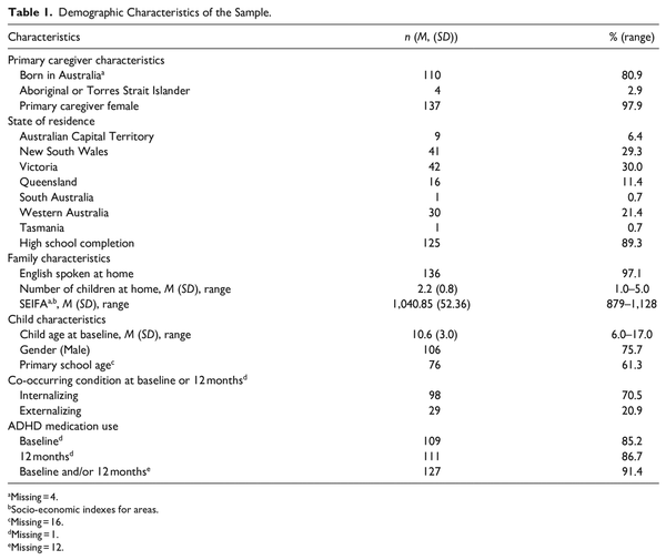 In the baseline survey, parents reported their country of birth, Australian state of residence (by postcode), primary language spoken at home, Aboriginal or Torres Strait Islander status, high school completion, number of children in the home, child age, and child gender. Information regarding the child’s ADHD medication use, and diagnosis or treatment of any co-occurring internalizing (anxiety and depression) or externalizing (oppositional defiant disorder and conduct disorder) conditions were assessed at baseline and the 12-month follow-up. The Socio-Economic Indexes for Areas (SEIFA; ) was calculated as a general socio-economic indicator based on participants’ postcode at baseline.