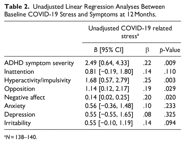 Bivariate correlations between the variables of interest can be found in Supplemental Table 2. In the unadjusted models, baseline COVID-19 stress was significantly associated with increased 12-month ADHD symptom severity (β = .22, p = .009), and more specifically, increased hyperactivity/impulsivity symptoms (β = .25, p = .003; see Table 2). COVID-19 stress was also significantly associated with increased oppositional symptoms (β = .19, p = .029), and negative affect (β = .20, p = .020) at 12 months (see Table 2). There was no significant association between COVID-19 stress and inattention symptoms, anxiety, depression, or irritability.