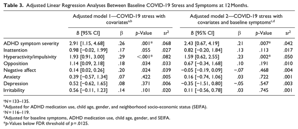 When adjusting for covariates, baseline COVID-19 stress remained significantly associated with increased ADHD symptom severity (β = .26, p = .001) and hyperactivity/impulsivity symptoms (β = .29, p < .001) at 12 months. While associations were also shown between COVID-19 stress and increased oppositional symptoms (β = .18, p = .034), and negative affect (β = .20, p = .024), these findings did not survive FDR correction (see Table 3). When adjusting for covariates and baseline symptoms, baseline COVID-19 stress remained associated with increased ADHD symptom severity (β = .21, p = .007) and hyperactivity/impulsivity symptoms (β = .23, p = .002) at 12 months (see Table 3). Both associations survived FDR correction. An expanded version of this table including baseline symptoms and covariates is presented in Supplemental Table 3.