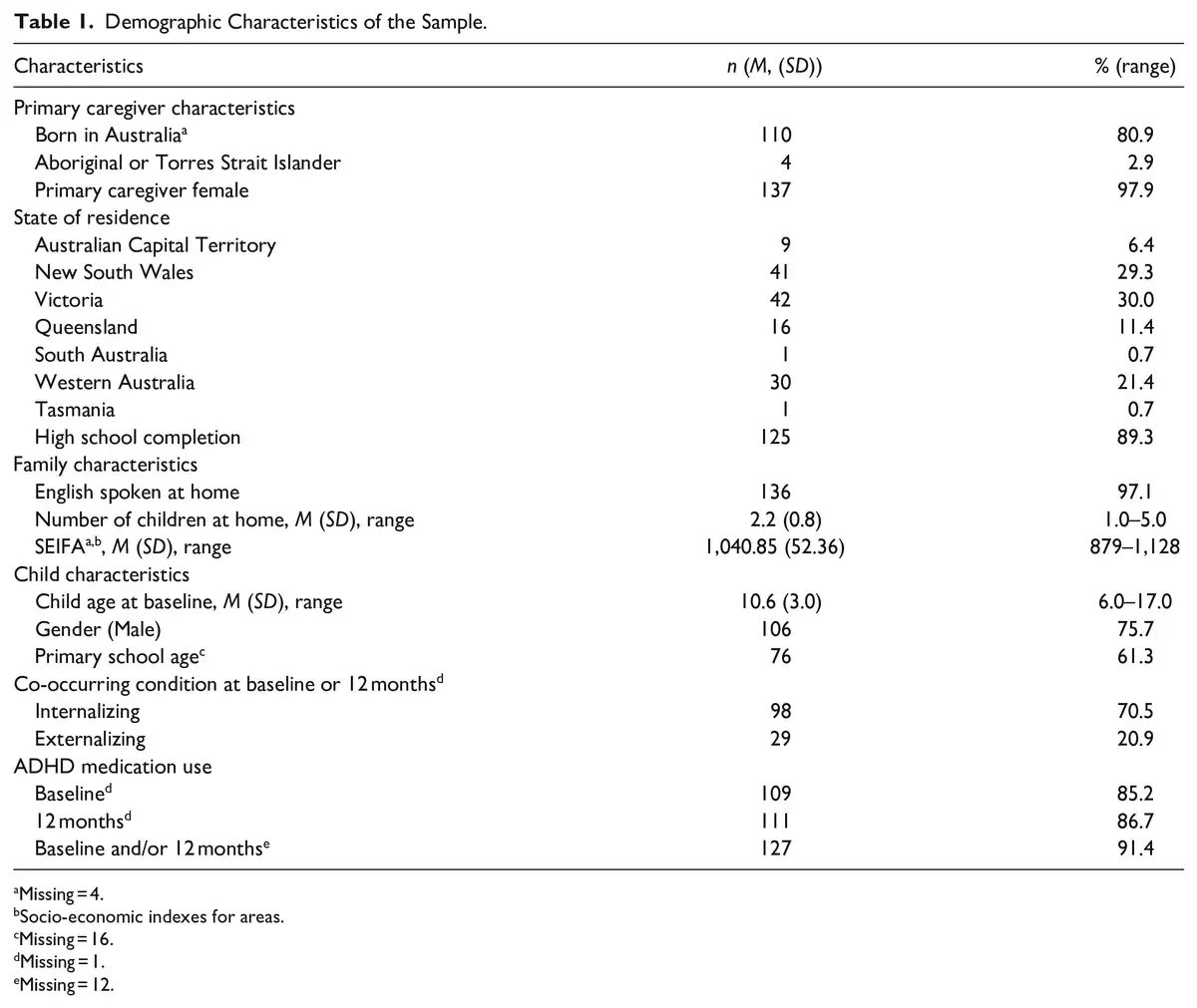 In the baseline survey, parents reported their country of birth, Australian state of residence (by postcode), primary language spoken at home, Aboriginal or Torres Strait Islander status, high school completion, number of children in the home, child age, and child gender. Information regarding the child’s ADHD medication use, and diagnosis or treatment of any co-occurring internalizing (anxiety and depression) or externalizing (oppositional defiant disorder and conduct disorder) conditions were assessed at baseline and the 12-month follow-up. The Socio-Economic Indexes for Areas (SEIFA; ) was calculated as a general socio-economic indicator based on participants’ postcode at baseline.