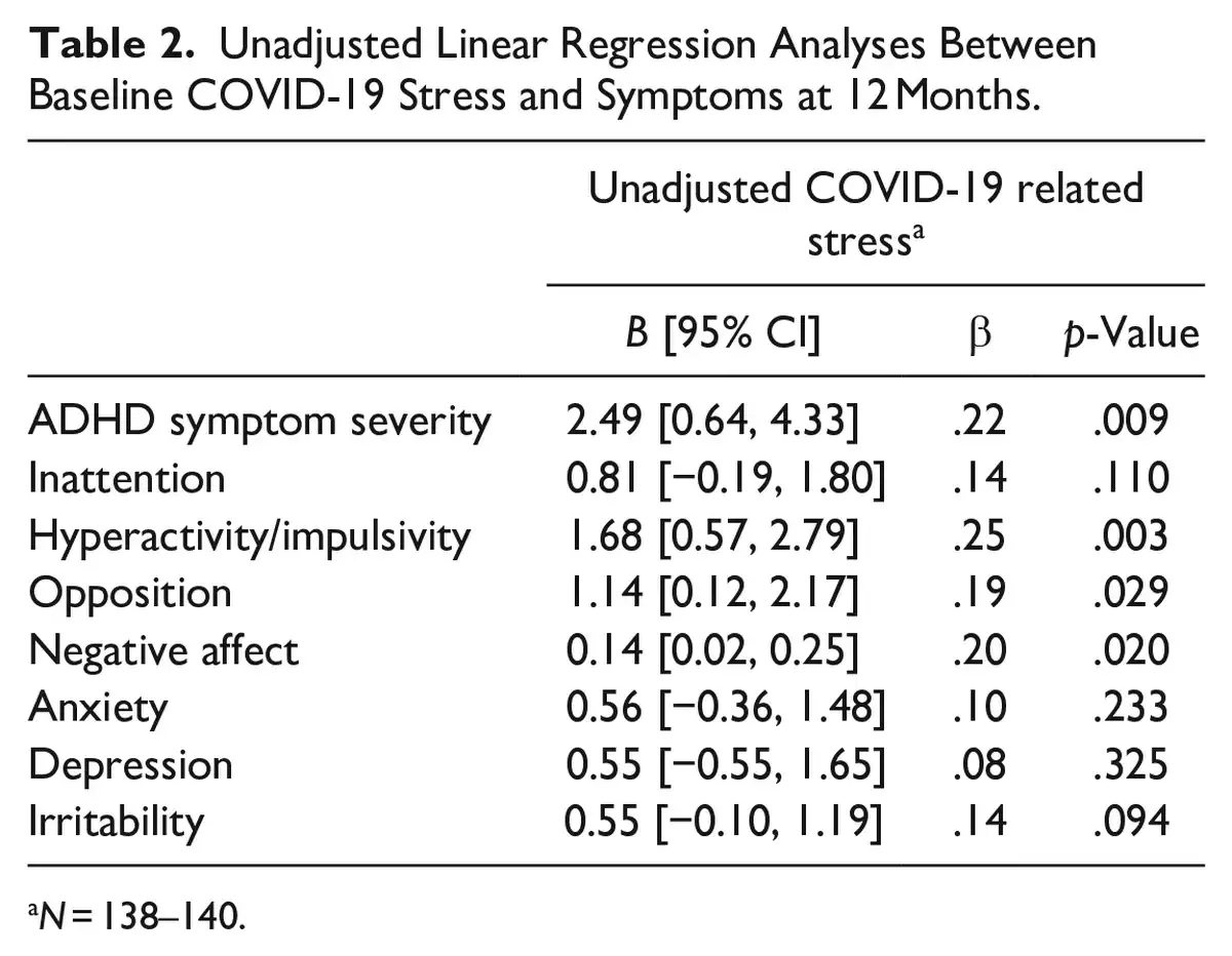 When adjusting for covariates, baseline COVID-19 stress remained significantly associated with increased ADHD symptom severity (β = .26, p = .001) and hyperactivity/impulsivity symptoms (β = .29, p < .001) at 12 months. While associations were also shown between COVID-19 stress and increased oppositional symptoms (β = .18, p = .034), and negative affect (β = .20, p = .024), these findings did not survive FDR correction (see Table 3). When adjusting for covariates and baseline symptoms, baseline COVID-19 stress remained associated with increased ADHD symptom severity (β = .21, p = .007) and hyperactivity/impulsivity symptoms (β = .23, p = .002) at 12 months (see Table 3). Both associations survived FDR correction. An expanded version of this table including baseline symptoms and covariates is presented in Supplemental Table 3.