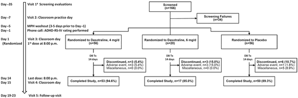 This double-blind, parallel-group study randomized children with ADHD to fixed, once-daily evening doses of dasotraline, 4 mg and 6 mg, or placebo in a laboratory classroom setting. Randomization, initially in a 1:1:1 ratio, was performed utilizing a computerized random number generator. However, after blinded safety review that identified a higher than expected rate of discontinuation due to nonserious, neuropsychiatric adverse events, and following a protocol amendment, the 6 mg/day dose of dasotraline was discontinued. The study remained fully blinded, and no further changes were made to any other aspect of study design.