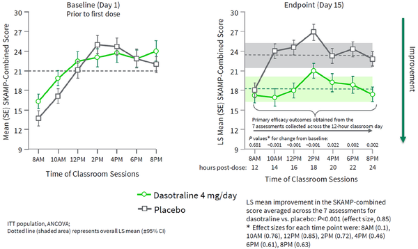 Mean SKAMP-combined scores during seven assessments performed on pre-treatment Day 1, and at double-blind endpoint on Day 15 for patients assigned to dasotraline 4 mg/day and placebo.