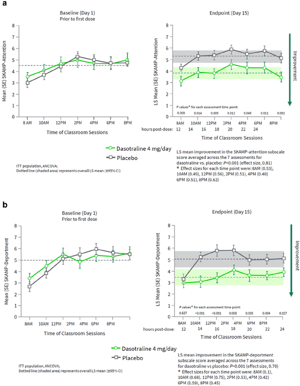 Onset of significant improvement in the SKAMP-combined score for dasotraline 4 mg/day was observed at the second assessment time-point (10:00 a.m.; 14 h postdose) and was maintained through the seventh and final time-point (8:00 p.m.; 24 h postdose; Figure 2). Significant improvement was observed starting at 8:00 a.m. on the SKAMP-attention subscale and starting at 10:00 a.m. on the SKAMP-deportment subscale and was maintained on both subscales through the final time-point (8:00 p.m.; 24 h postdose; Figure 3a and b).