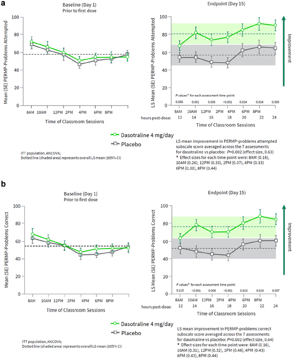 Onset of significant improvement in the PERMP-problems attempted and PERMP-problems correct scores for dasotraline 4 mg/day was observed at the second assessment time-point (10:00 a.m.; 14 h postdose) and was maintained through the seventh and final time-point (8:00 p.m.; 24 h postdose; Figure 4).
