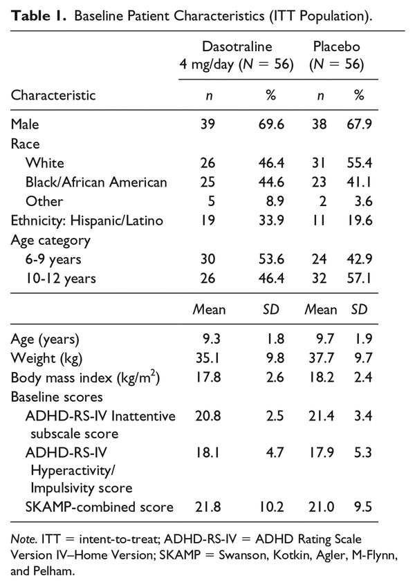 The sample size for this study was determined by a two-sample t test using nQuery Advisor (Version 7.0) software. Based on results of a previous 12-h laboratory classroom study (), a sample size of 50 patients per treatment arm was estimated to provide at least 95% power to detect a mean 4-point difference (SD = 5) in baseline-to-Day-15 SKAMP-Combined change scores as statistically significant for dasotraline versus placebo at a 5% significance level (two-sided). To account for an expected attrition rate of 10%, the sample size per treatment arm was adjusted to 55 patients.