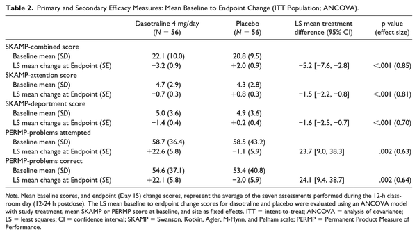 Dasotraline was found to be an efficacious treatment for ADHD in children aged 6 to 12 years in this double-blind, placebo-controlled, simulated classroom study. Two weeks of treatment with fixed-dose dasotraline 4 mg/day was associated with significant improvement in the SKAMP-combined score, the primary efficacy endpoint (effect size = 0.85; averaged over the seven assessment time-points), and across all secondary efficacy endpoints, comprising SKAMP-attention (effect size = 0.81) and SKAMP-deportment (effect size = 0.70) subscale scores, and PERMP scores for problems attempted (effect size = 0.63) as well as problems correct (effect size = 0.64).