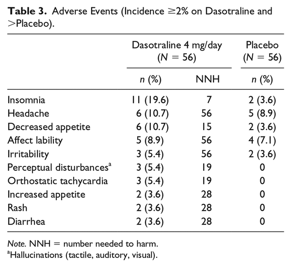 Descriptive statistics were used for safety variables, including adverse events, vital signs, and laboratory test results. Number needed to harm (NNH) for selected adverse events was calculated by assessing the reciprocal of the difference in adverse effect rates for the dasotraline and placebo groups. Cohen’s d effect sizes were calculated for efficacy measures as the difference in drug versus placebo change scores divided by the pooled standard deviation ().