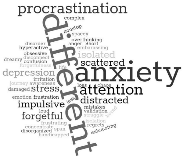 Two focus groups (eight participants in the first group, six in the second) were conducted via Zoom and were video recorded. Based on previous work (), two focus groups are sufficient to capture 80% of themes. Upon beginning the recording, confidentiality was discussed and participants were given the opportunity to change the presentation of their name to protect their anonymity. Explicit rules for camera use were not provided. Groups lasted 2 hr, and were semi-structured to include a brief introduction to the group facilitators and the study. Then, participants were asked to type open-ended responses to the ice breaker prompt, “What does ADHD mean to you?” Responses were collated into a word cloud and shared with participants (Figure 1). Next, participants selected forced choice responses of “yes,” “no,” or “not sure” to indicate their responses to the following statements: “Being diagnosed with ADHD has changed my life for the better,” “Being diagnosed with ADHD has made my life harder,” and “It was hard for me to get a diagnosis of ADHD.” Responses were used to facilitate group discussion. Both authors co-facilitated focus groups. The authors have extensive clinical and research experience focused on females with neurodevelopmental disorders, including ADHD and autism, allowing them to ask informed follow-up questions to facilitate discussion in the focus groups.