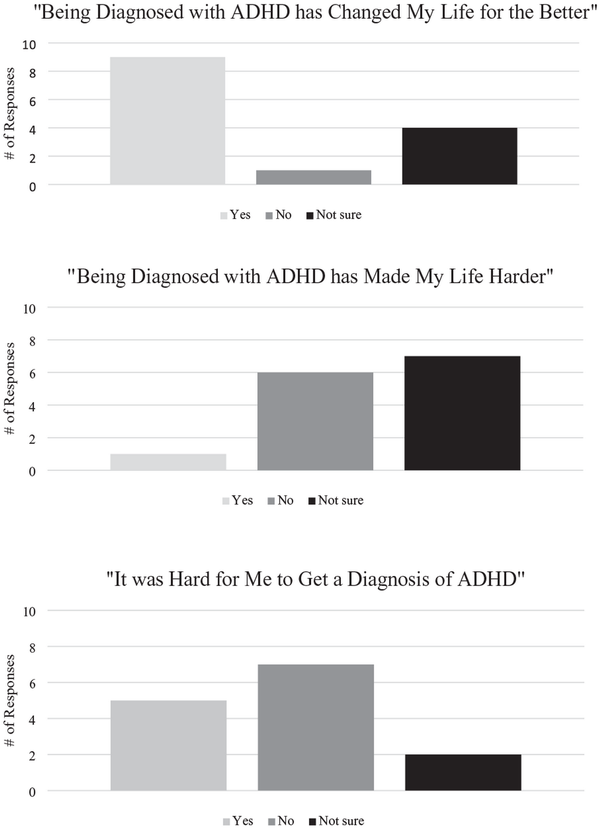 Poll results are reported in Figure 2. A majority (64%) reported that receiving an ADHD diagnosis has changed their life for the better, and provided validation, increased self-compassion, new opportunities for adaptive coping and treatment, and greater social support. Some (29%) reported feeling unsure, and 7% denied that receiving the diagnosis had changed their life for the better.
