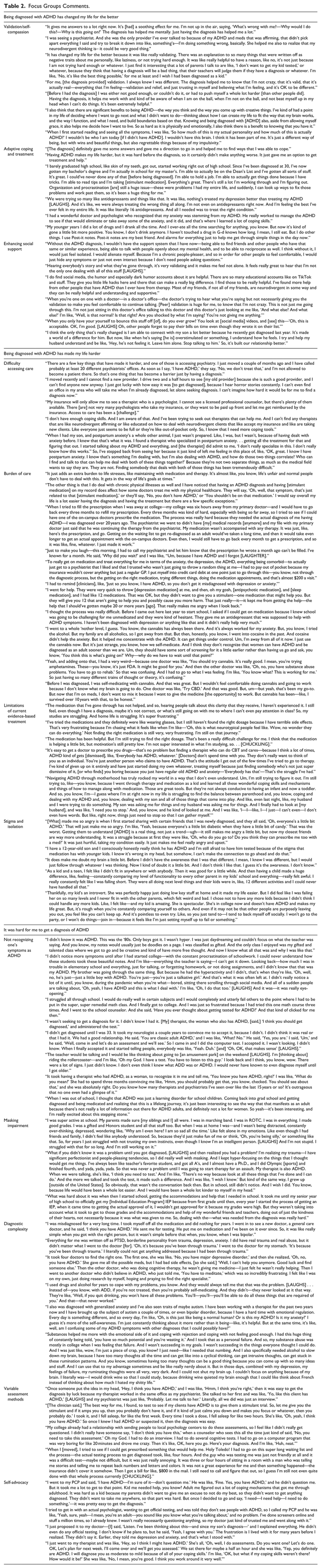 The themes that emerged in this study of women are consistent with those previously identified in other qualitative studies conducted primarily among younger and older adult women with ADHD (; ; ). Altogether this work points to considerable benefits as well as barriers to care for women with ADHD. This qualitative data provides critical firsthand perspective that is needed to contextualize extant quantitative findings showing marked increases in treatment for ADHD among adult women (; ; ). By integrating quantitative and qualitative data through mixed methods research, the current work strives to ensure that findings are aligned with and reflect the values, priorities, and interests of women with ADHD (). This is a notable advancement in the study of ADHD in women, as the majority of research on ADHD has prioritized school-aged boys. Our research group intends to use the themes identified from these focus groups to conduct one-on-one interviews with women with ADHD. Individual interviews may provide even more fine-grained detail on women’s experiences with ADHD beyond the findings that emerged from the focus groups.