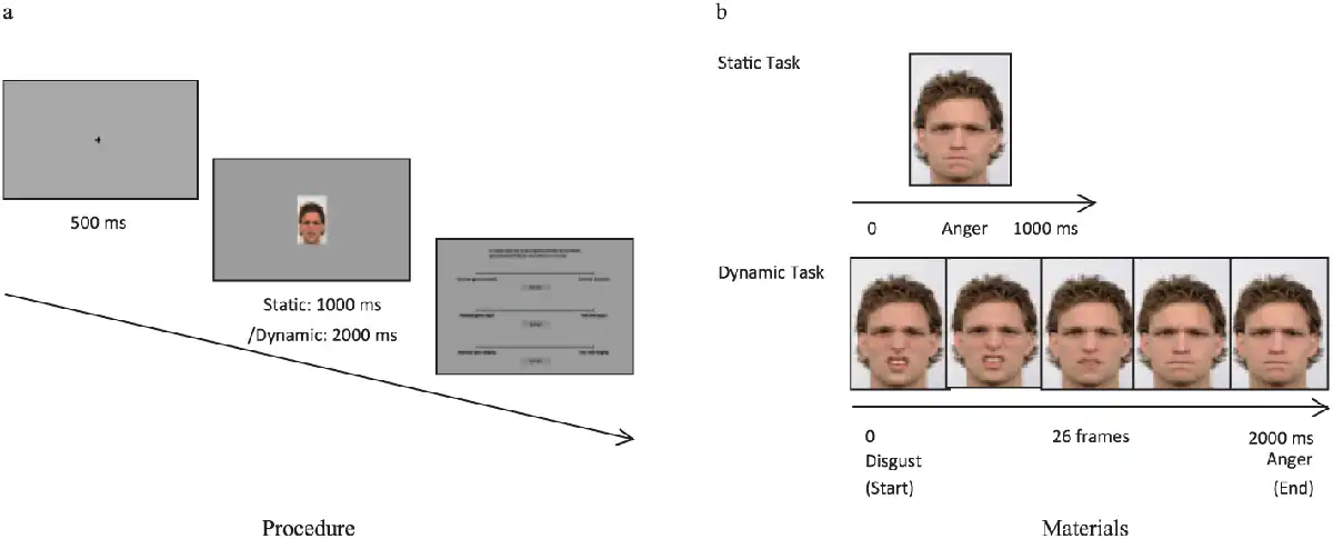Note. (a) In the static task, each trial started with a fixation cross displayed for 500 ms, followed by a photograph shown for 1,000 ms, and ending with a screen with three scales asking participants to indicate the emotions they perceived on the face. In the dynamic task, each trial started with a fixation cross lasting for 500 ms, followed by a dynamic (morphed) clip lasting a total of 2,000 ms, and ending with a screen with three scales asking participants to indicate the last emotional expression they perceived on the face. (b) A facial expression of anger, as used in the static task (above), and a subset of the morphs shown in a dynamic clip of disgust-to-anger, as used in the dynamic task (below).