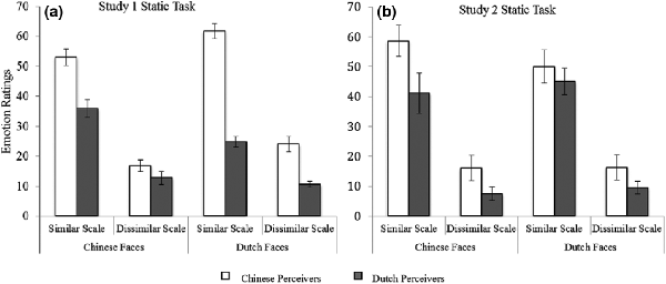 Note. (a) In Study 1, Chinese perceivers endorsed nonintended emotions to a greater extent than Dutch perceivers, and this effect was particularly pronounced for morphologically similar emotions. (b) In Study 2, this finding was only replicated for Chinese, but not for Dutch, faces. The error bars represent confidence interval.