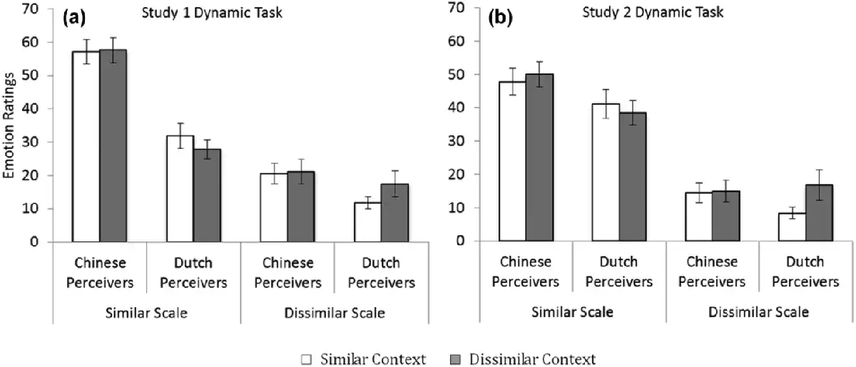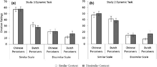 Note. A greater influence of context was found among Dutch perceivers than among Chinese perceivers. (a) In Study 1, context made Dutch perceivers endorse nonintended emotions (congruent with the preceding expressions) to a greater extent for ratings on both morphologically similar and dissimilar emotions, but context did not affect Chinese perceivers’ judgments. (b) In Study 2, context made Dutch perceivers endorse nonintended emotions (congruent with the preceding expressions) to a greater extent for ratings on the morphologically dissimilar emotions but not for ratings on the morphologically similar emotions; context did not affect Chinese perceivers’ judgments. The error bars represent confidence interval.