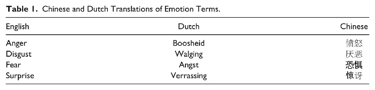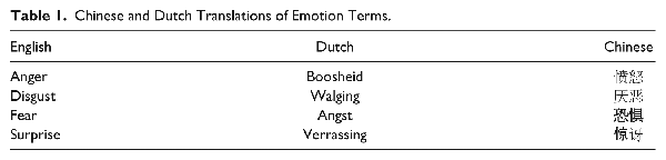 The emotion terms in the current research were taken from the respective facial expression databases (i.e., the terms are used to denote the various facial expressions in each stimulus set; see Table 1). They were back-translated into English by a native speaker of each language to verify accurate translation. The instructions were translated from English into Chinese and Dutch by means of the standard translation/back-translation procedure.