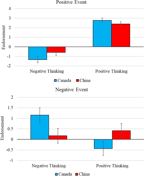 Chinese and Euro-Canadian endorsements with positive and negative thinking for positive and negative events. (Study 1.)