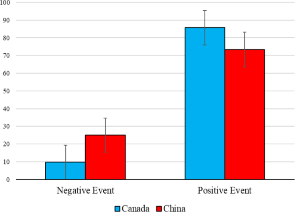 To find positive and negative events that would be considered equally positive or negative by Chinese and Canadian participants, we had a group of university students in China (n = 197) and Canada (n = 145) read events considered applicable in both China and Canada, and then they rated how positive/negative they believed each of the events was, using a scale ranging from −5 (Extremely Negative) to +5 (Extremely Positive). Of 183 events, 34 events (19%) showed minimal cross-group differences (ps > 0.20). From these 34 events, three positive and three negative events were selected on the basis of positive/negative events being similar in terms of absolute magnitude (positive events: +3.40 to +3.96; negative events: −3.43 to −4.02).