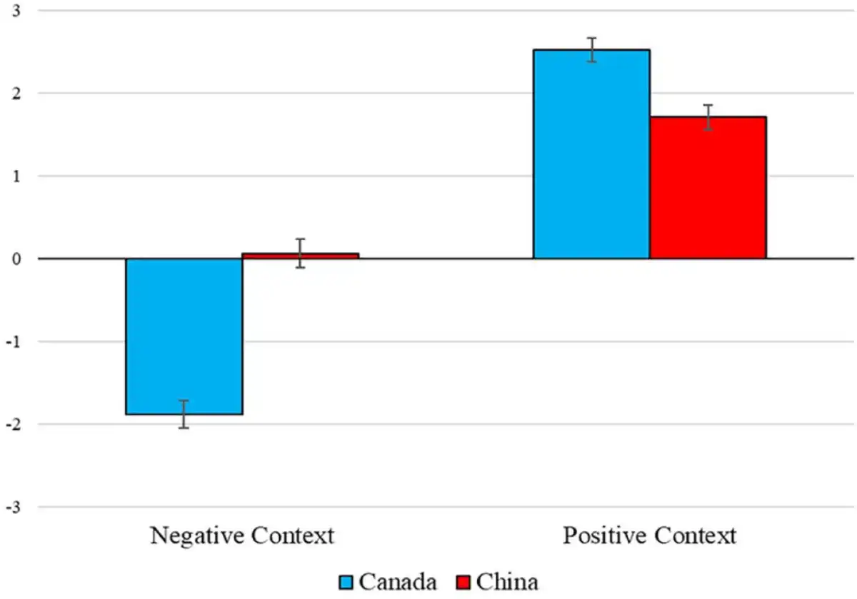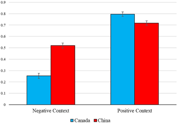 Overall, Chinese thought more positively in a negative context and thought slightly more negatively in a positive context, compared to Euro-Canadians. Thus, with a binary choice task, Study 2 replicated Study 1’s results, revealing that cultural differences in positive thinking actually depend on context. Importantly, these findings undermine the potential criticism that Study 1’s effects were driven by cultural differences in extreme responding.