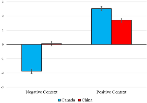 3. A pretest confirmed that both Chinese and Euro-Canadians agreed that these responses were positive and negative respectively (according to one-sample t-tests for each stimulus compared against 0, calculated separately for Chinese and Euro-Canadians; ts > |7.39|, ps < 0.031, ds > |0.27|).