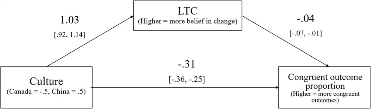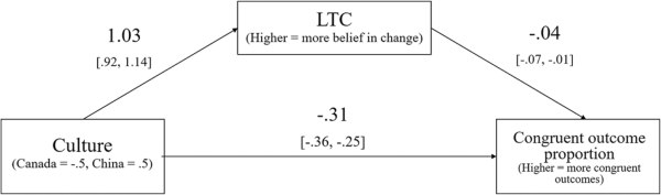 Belief in lay theory of change mediates the relationship between culture (Chinese vs Euro-Canadian) and proportion of congruent outcomes.