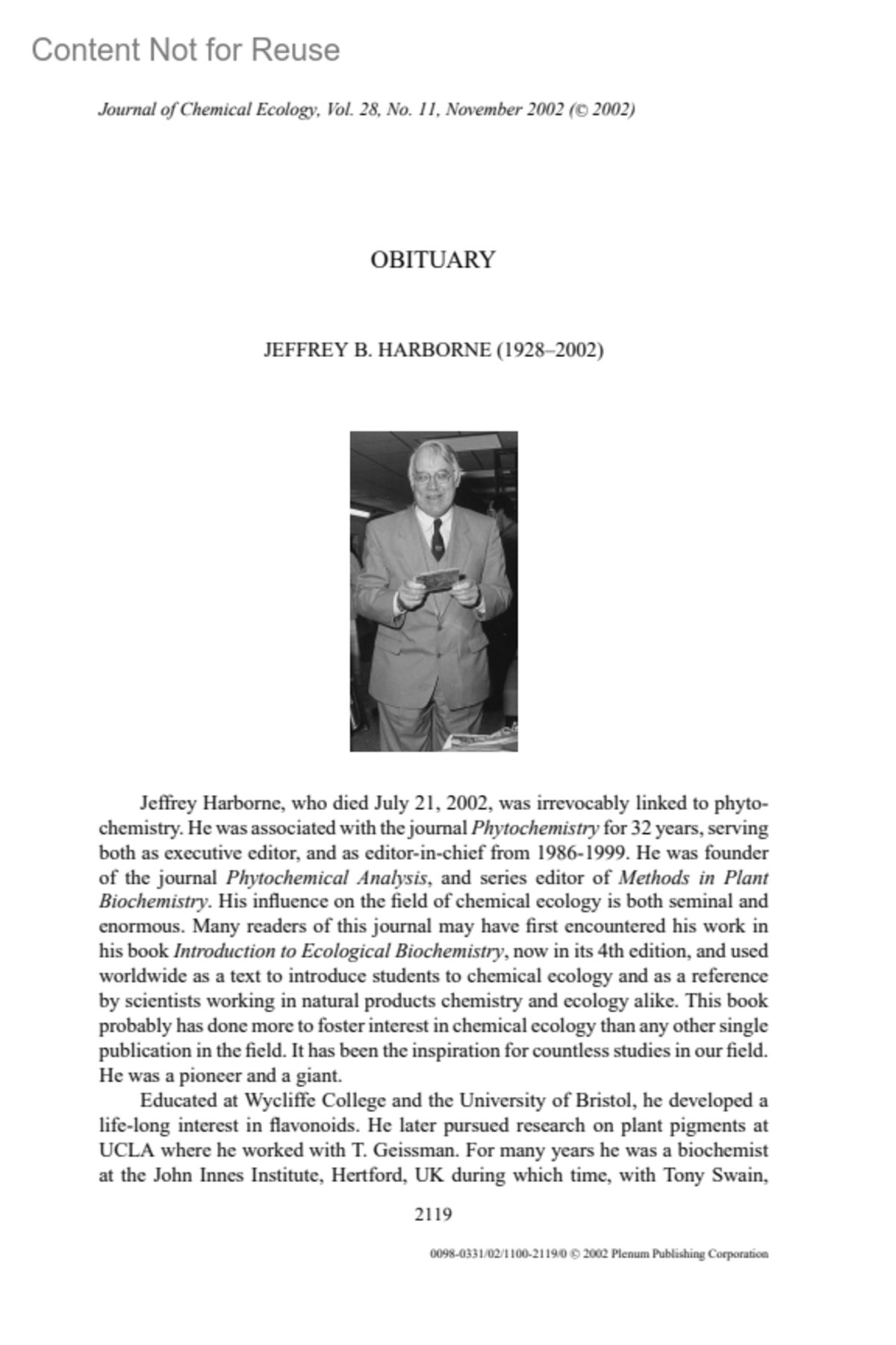 OBITUARYJEFFREY B. HARBORNE (1928–2002)Romeo, John T.Author informationEditorJournal of Chemical Ecology 28(11):p 2119-2120, November 2002.Copyright ©2002 Kluwer Academic Publishers