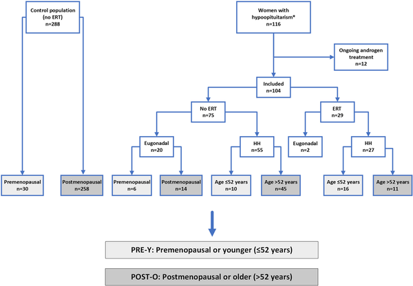 Abbreviations: ERT, estrogen replacement therapy; HH, hypogonadotropic hypogonadism; PRE-Y, premenopausal or younger (≤52 years); POST-O, postmenopausal or older (>52 years).