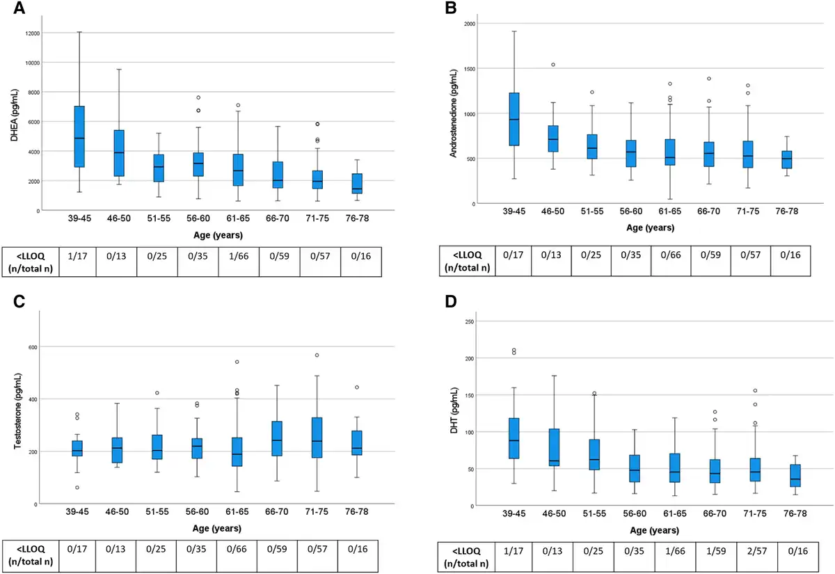 We first assessed serum levels of sex steroid precursors (DHEA, androstenedione) and active androgens (testosterone and DHT) across age categories in the control group (Fig. 2). With a few exceptions, androgen levels in the control group were above the assay LLOQ, confirming the high sensitivity of our assay. With increasing age, levels of DHEA, androstenedione, and DHT declined. By contrast, testosterone levels showed no statistically significant association with age (Fig. 2).