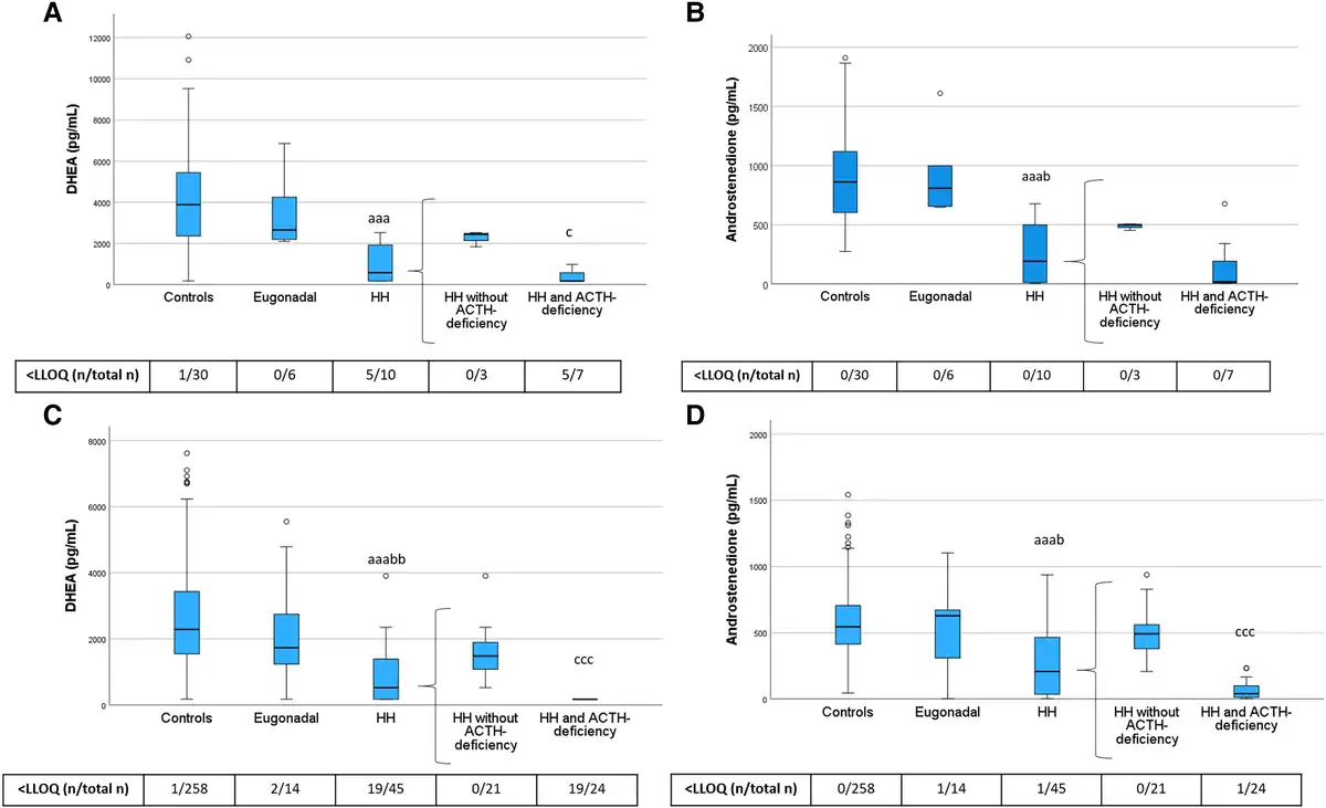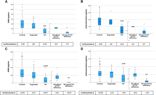 DHEA and androstenedione levels in PRE-Y (A, B) and POST-O (C, D) women with hypopituitarism and controls. All women were without ERT. Box boundaries represent the 25th to 75th percentile, horizontal bars represent median values, whiskers represent lowest/highest values that is not an outlier, and circles represent statistical outliers. aaaP < .001 vs controls, bP < .05, bbP < .01 vs eugonadal, cP < .05 cccP < .001 vs HH without ACTH deficiency. (Kruskal–Wallis test, with multiple pairwise comparisons by Dunn–Bonferroni test, was used to compare controls, engonadal, and HH. Mann–Whitney U-test was used to compare HH with and without ACTH deficiency.) Values < LLOQ were set to LLOQ/√2 in the analysis.