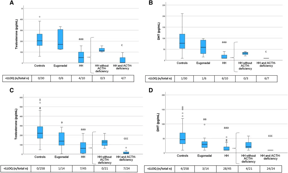 Abbreviations: ERT, estrogen replacement therapy; DHT, dihydrotestosterone; HH, hypogonadotropic hypogonadism; LLOQ, lower limit of quantification; PRE-Y, premenopausal or younger (≤52 years); POST-O, postmenopausal or older (>52 years).